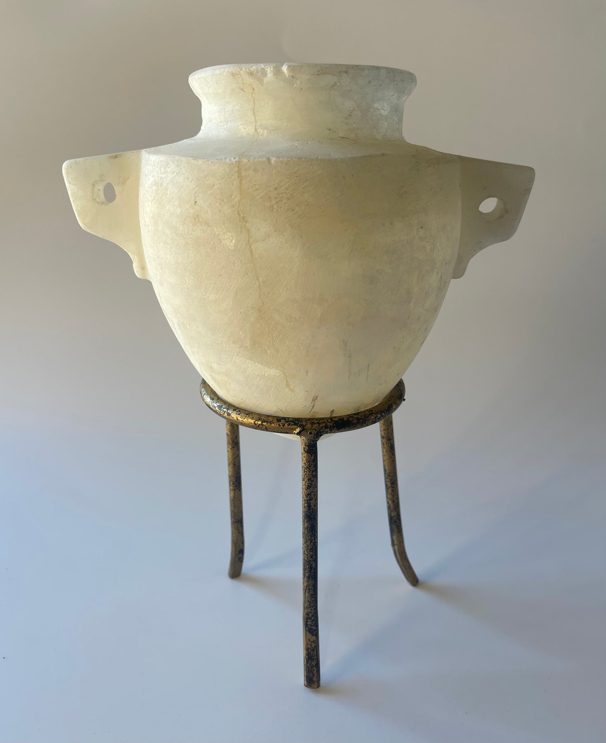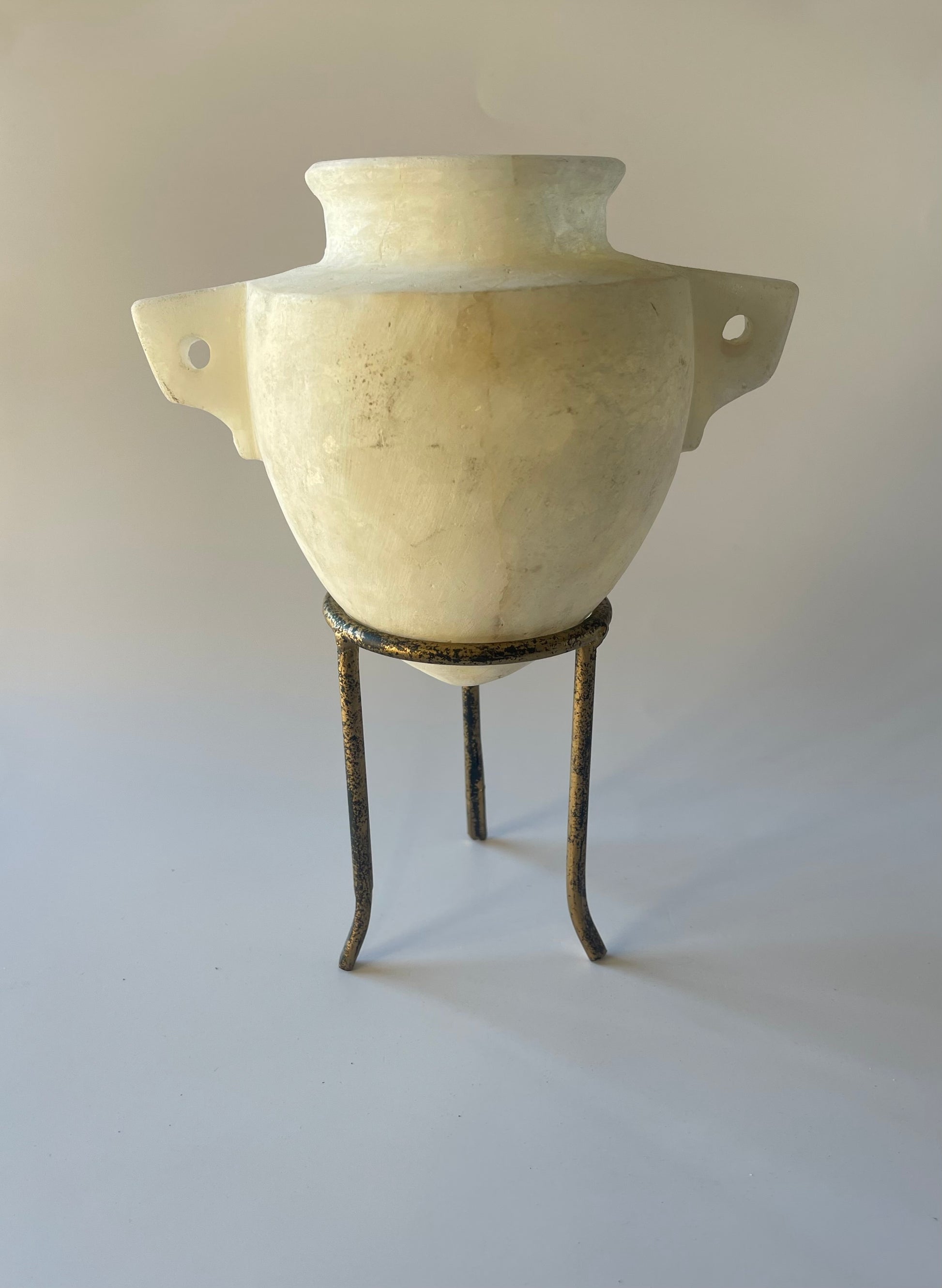 Like a sacred offering from the Temple of Isis, this elegant alabaster jar rests regally upon its custom metal stand. The combination of ethereal stone and architectural support creates a piece worthy of Amneris's private chambers in Verdi's grand Egyptian opera.